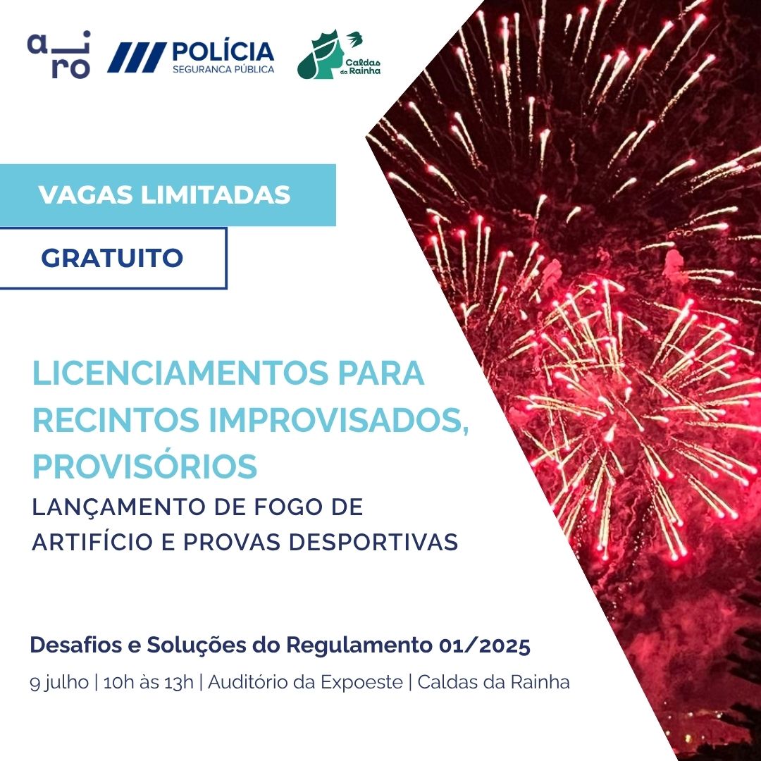 No passado dia 9 de julho, no auditório da Expoeste a AIRO, em parceria com o Comando Distrital de Leiria da PSP e o Município das Caldas da Rainha, apresentaram uma ação informativa sobre os Licenciamentos para Recintos Improvisados, Provisórios, Lançamento de Fogo de Artifício e Provas Desportivas.